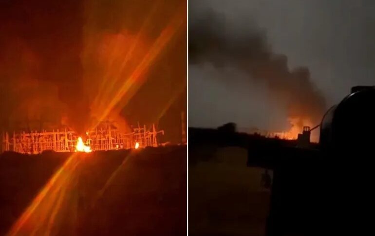 Video footage circulating online showed fires engulfing power transformers at Al-Merkhiyat substation.